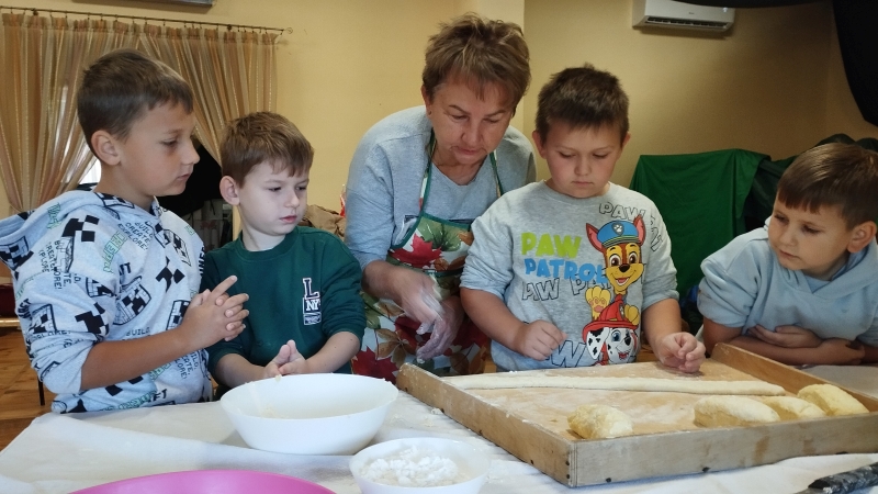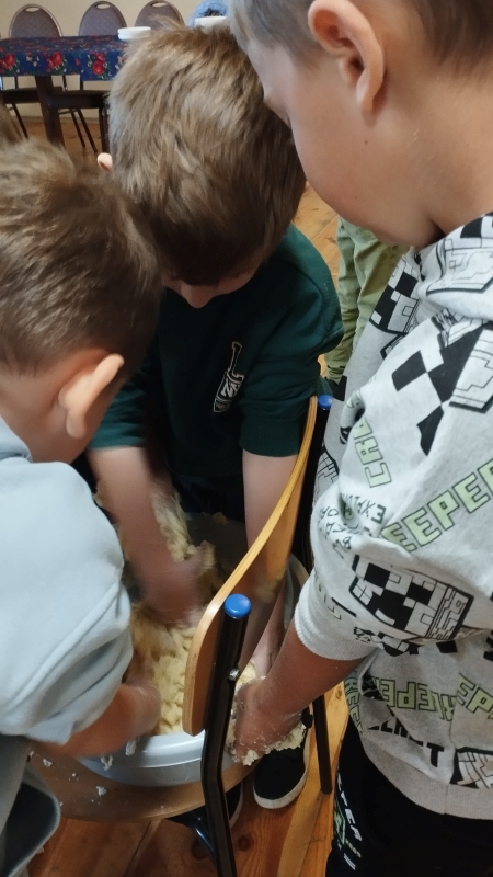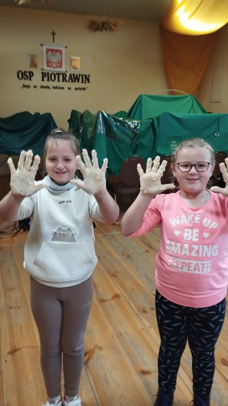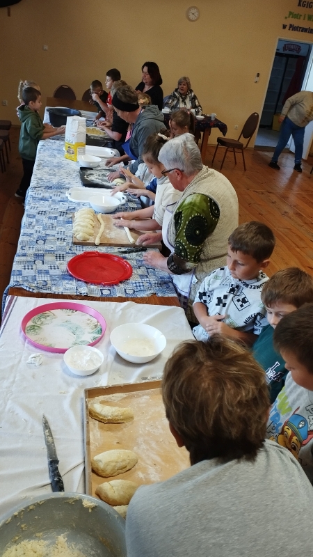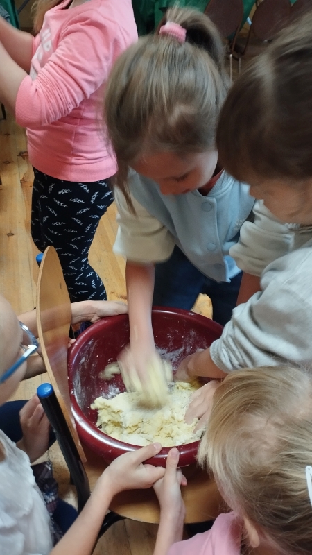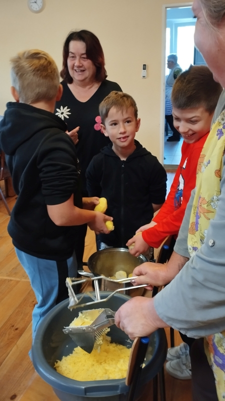 W dniu 2 października uczniowie klas 1 – 3 uczestniczyli w warsztatach kulinarnych przygotowanych przez KGiGW „Piotr i Wianki” w Piotrawinie. Już od progu poczuliśmy się mile widzianymi gośćmi. Naszym celem była nauka przygotowywania kopytek i kluseczków śląskich oraz doskonalenie umiejętności pracy zespołowej. Dzieci z wielkim zaangażowaniem zabrały się do pracy. Zagniatanie, krojenie i formowanie okazały się wielką frajdą. Wreszcie można było bezkarnie ubrudzić ręce i ćwiczyć umiejętności manualne. Wszyscy radzili sobie znakomicie. Tace zapełniały się w ekspresowym tempie. Czas oczekiwania na ugotowanie naszych wytworów przeznaczyliśmy na wspólne zabawy. Wreszcie degustacja! Z masełkiem, na słodko, ze skwarkami – wszyscy mogli wybrać, z czym mają ochotę zjeść kluski. Aż miło było patrzeć, jak dzieci pałaszują z wielkim apetytem. Pycha! Ale dobre! Superowskie! – takie komentarze było słychać z każdej strony. Apetyczne, bo wykonane własnoręcznie. Jak zawsze kochane Panie z KGiGW zapewniły również deser w postaci pączusiów, ciast i napojów. Zapakowały także „coś na wynos” dla członków rodzin uczestników warsztatów. Z całego serca dziękujemy za poświęcony nam czas, zwłaszcza w okresie zbiorów owoców. Było wspaniale!