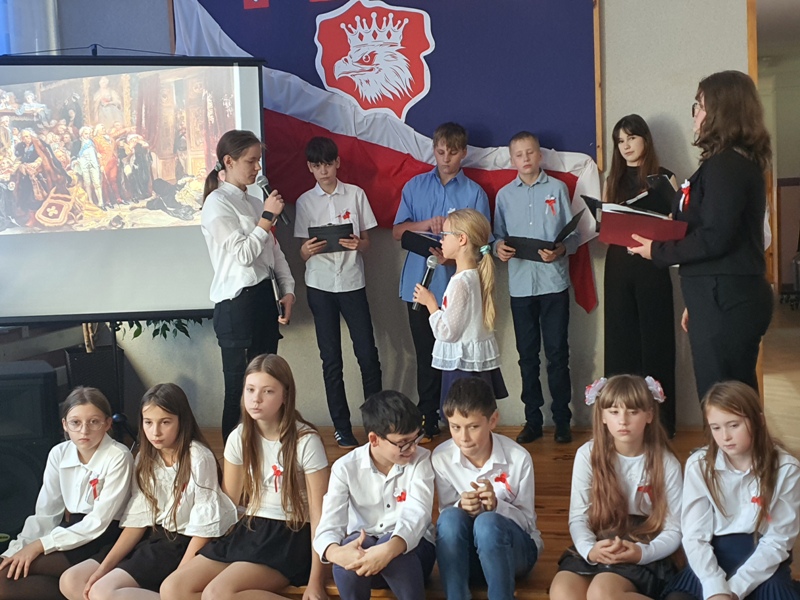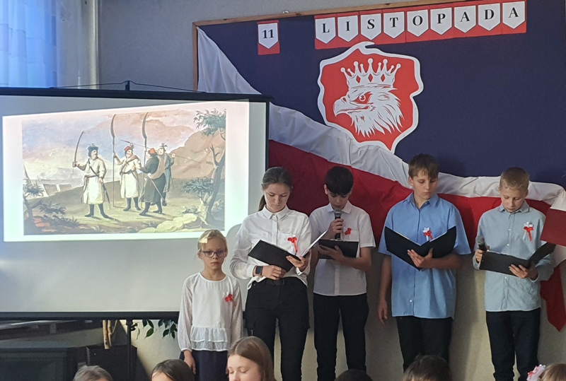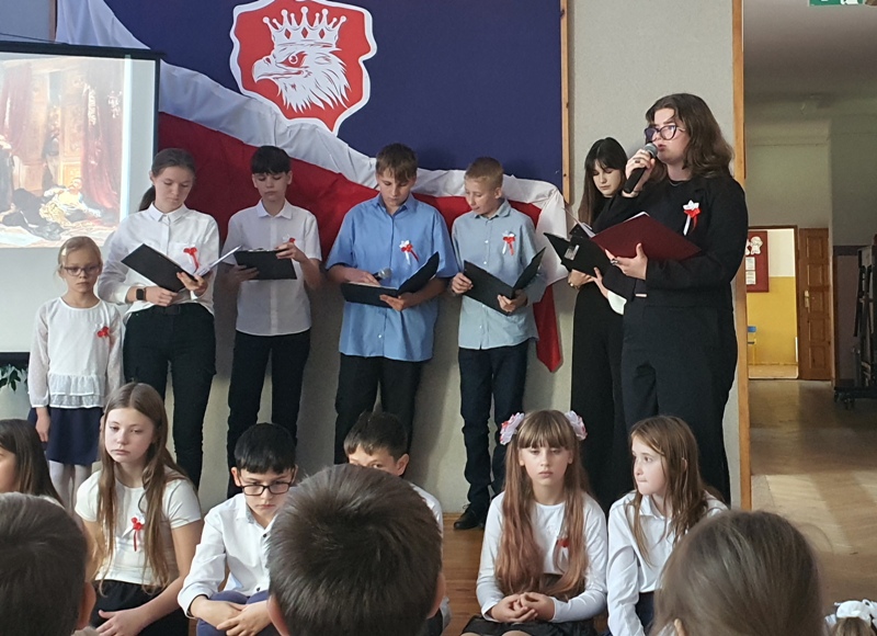 Uczniowie klasy VIII oraz uczennica klasy II w instalacji recytatorsko-multimedialnej przedstawili najważniejsze wydarzenia i postacie historyczne z lat 1772-1918.