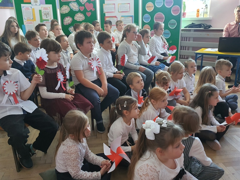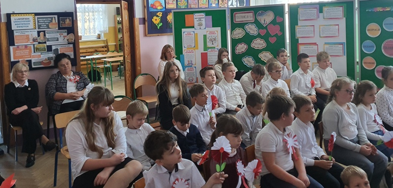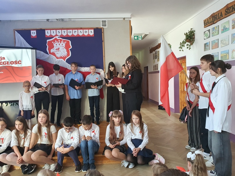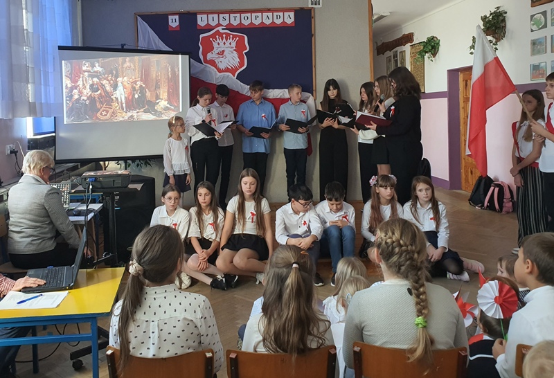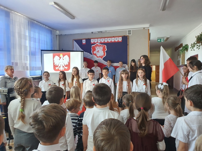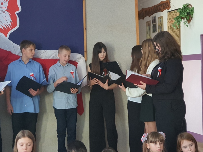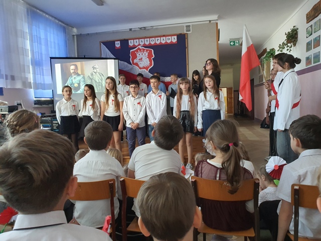 Uczniowie klasy V, z należytą powagą i zaangażowaniem, zaśpiewali pieśni patriotyczne.