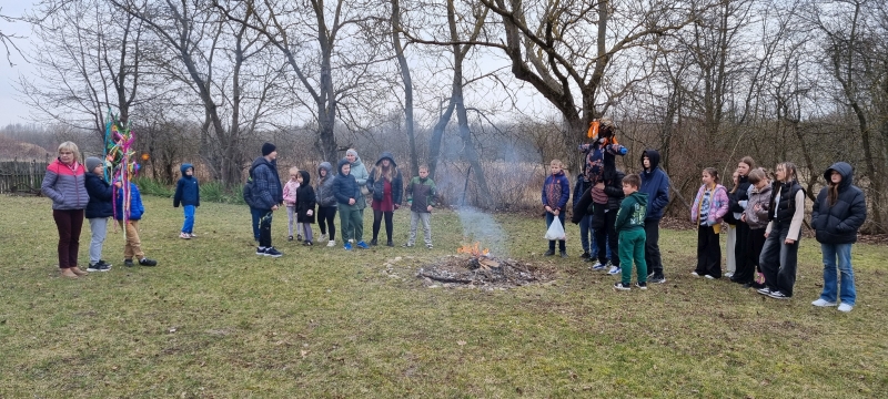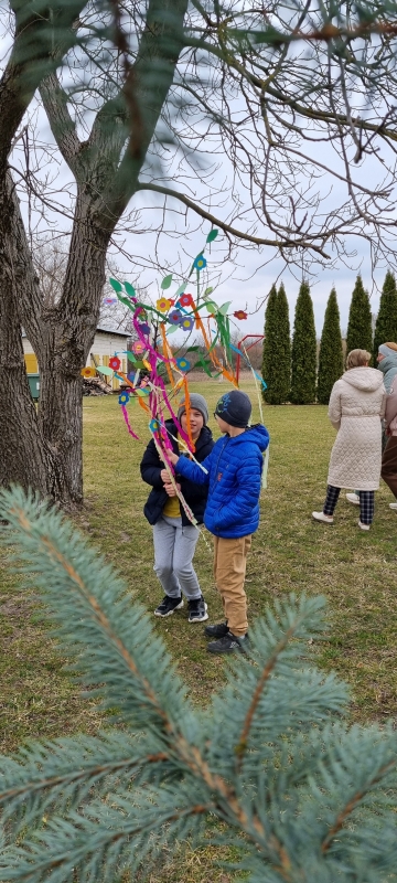 Zgodnie z tradycją, na terenie zielonym wokół szkoły pożegnaliśmy zimę, żegnając Marzannę, a następnie radośnie powitaliśmy wiosnę, wprowadzając symboliczny gaik.