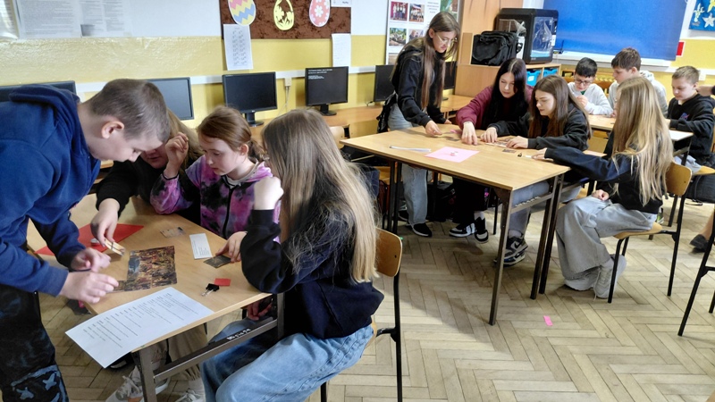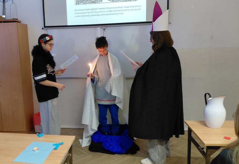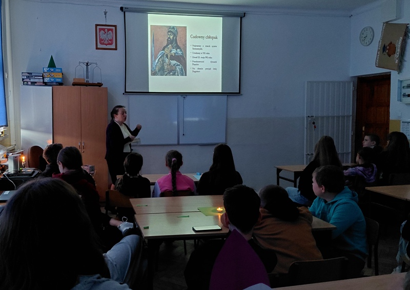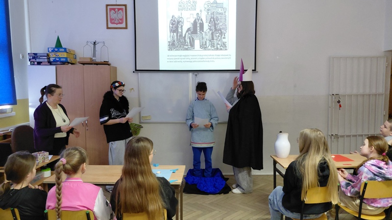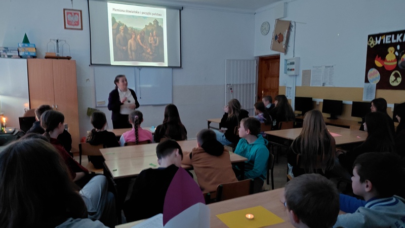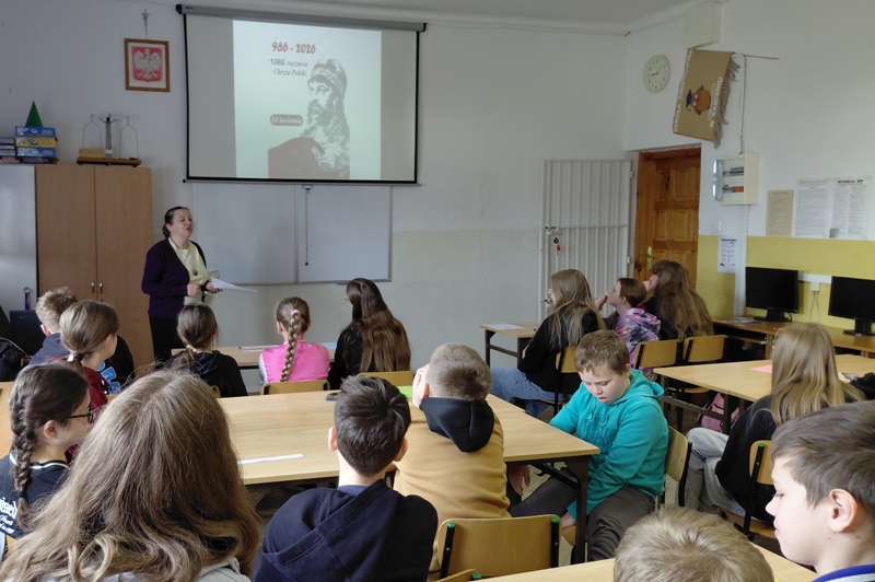 W dniu 14 kwietnia 2026 r. uczniowie klas IV–VIII uczestniczyli w wyjątkowej lekcji historii zorganizowanej w ramach obchodów 1060. rocznicy Chrztu Polski. W tę niezwykłą podróż od pogaństwa do chrześcijaństwa zabrała ich pani Marta Lorek. Podczas spotkania nie zabrakło opowieści o dawnych wierzeniach Słowian, legendach oraz elementów dramy, w której uczniowie wcielili się w postacie biskupa Jordana, Dobrawy i Mieszka I. Dzięki temu mogli lepiej zrozumieć realia i znaczenie wydarzeń sprzed ponad tysiąca lat. Uczniowie aktywnie uczestniczyli w zajęciach, tworząc chronologię wydarzeń na podstawie wysłuchanego wiersza. Omówili również obraz Jana Matejki „Zaprowadzenie chrześcijaństwa”, zwracając uwagę na jego symbolikę i przekaz historyczny. W trakcie lekcji przedstawiono także najważniejsze przyczyny i skutki chrztu Mieszka I, podkreślając jego znaczenie dla rozwoju państwa polskiego i jego miejsca w Europie. Zajęcia były nie tylko okazją do poszerzenia wiedzy historycznej, ale także do rozwijania wyobraźni i aktywnego uczestnictwa w poznawaniu przeszłości.
