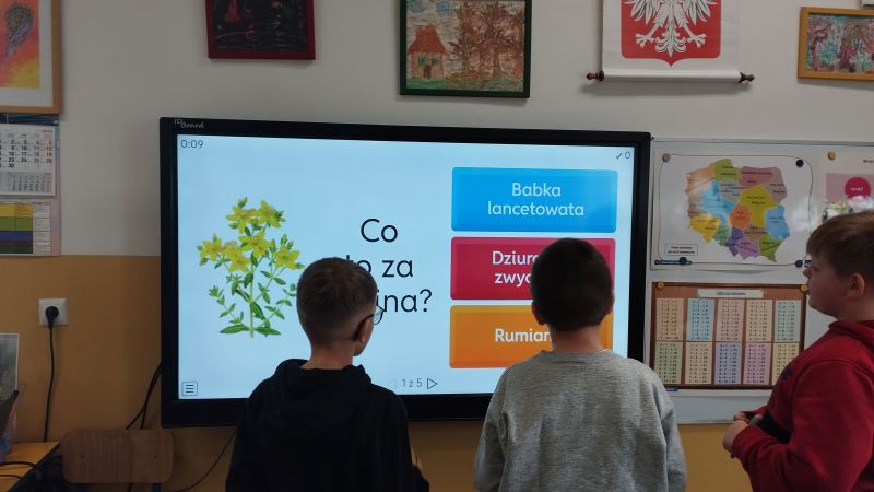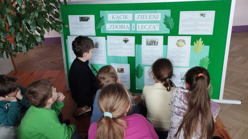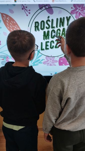 Tablica informacyjna dotycząca uprawy i pielęgnacji roślin leczniczych dała uczniom wiedzę na temat nawożenia i warunków bytowania. Uczniowie klasy 3 obejrzeli prezentację o roślinach leczniczych, rozwiązali także quiz dotyczący znajomości ich właściwości.